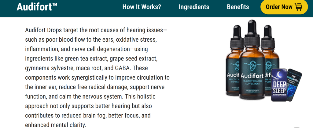 Audifort Drops are sold as a dietary supplement designed to “support” hearing health. According to promotional material, the product aims to reduce ringing or buzzing in the ears, promote ear comfort, calm the nervous system, and support overall auditory wellness. It’s often described as a natural alternative for people experiencing age-related hearing changes, noise sensitivity, or tinnitus.