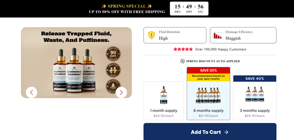 The product is marketed as a daily herbal supplement for balancing fluids, improving circulation, and supporting lymphatic function. It is also promoted as a way to reduce puffiness and bloating while helping the body detox naturally. The formula includes ingredients like burdock root, red clover, and ginger. These herbs are known in traditional remedies, but traditional use does not equal proven effectiveness for lymphatic drainage or fluid retention.