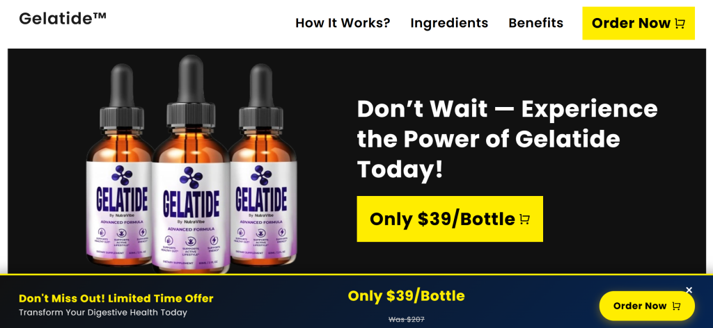 Gelatide Drops are marketed as a liquid dietary supplement designed to support weight loss and overall wellness. Depending on where you encounter them, the claims shift slightly. Some sellers emphasize metabolism support. Others suggest appetite control, hormone activation, or fat-burning effects similar to popular weight loss medications. In many cases, the marketing hints that a gelatin-based trick or recipe is involved, but once you move through the presentation, no usable recipe or method ever appears. The only “solution” offered is the dropper bottle itself.