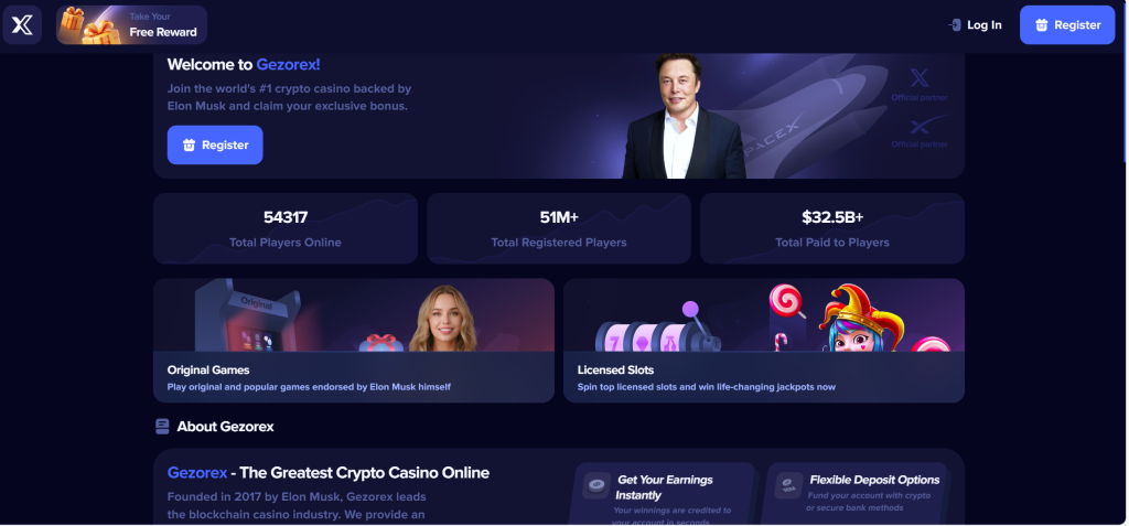 GEZOREX.COM presents itself as the #1 decentralized crypto casino backed by Elon Musk and Bill Gates, offering Crypto-based casino games such as Crash, Slots, Dice, and Plinko, quick deposits and withdrawals, large welcome bonuses up to $10,000, and supposed partnerships with celebrities and big brands. On the surface, it imitates legitimate crypto casinos, but once examined closely, the entire setup begins to fall apart.