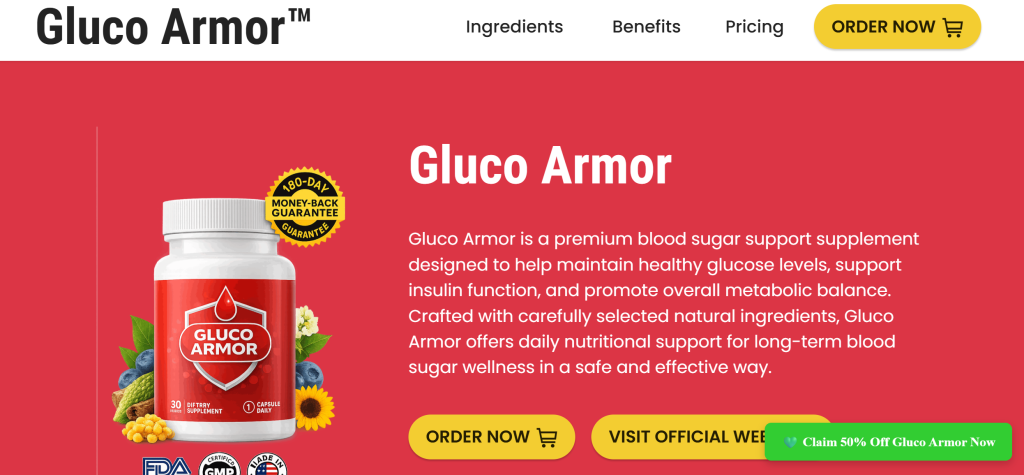 Gluco Armor is promoted as a natural dietary supplement designed to support healthy blood sugar levels and overall metabolic function. According to the promotional material, it helps the body process glucose more efficiently, reduce sugar cravings, and maintain stable energy throughout the day. Some of the main claims include supporting insulin sensitivity, balancing blood sugar levels, boosting metabolism, and even assisting with weight management. These are very broad claims, especially for a supplement, and they target a large number of people dealing with fatigue, cravings, and unstable glucose levels.