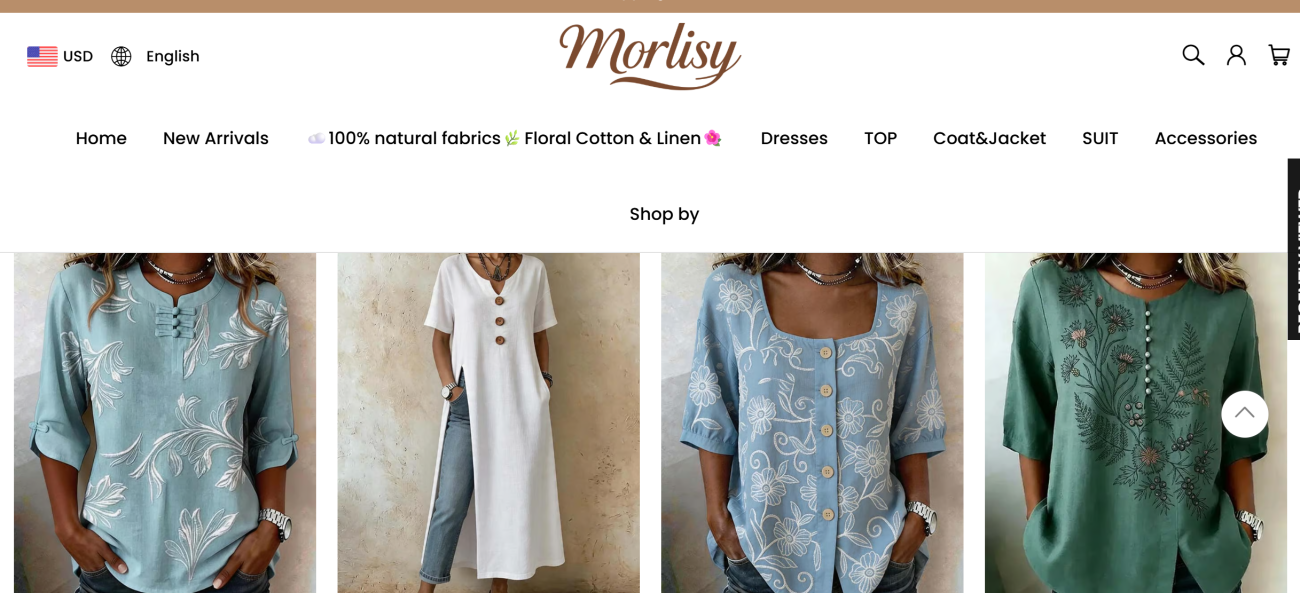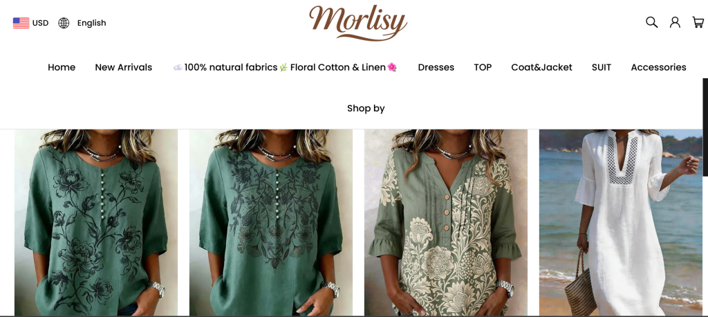 At first glance, Morlisy.com presents itself as a modern fashion store selling dresses, jackets, sweaters, and seasonal clothing.