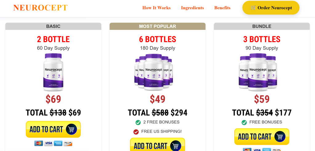Pricing for Neurocept is usually structured around bundle offers that encourage customers to purchase several bottles at once at a discounted price. This type of pricing strategy is common in supplement campaigns because it creates urgency while increasing the overall purchase amount.