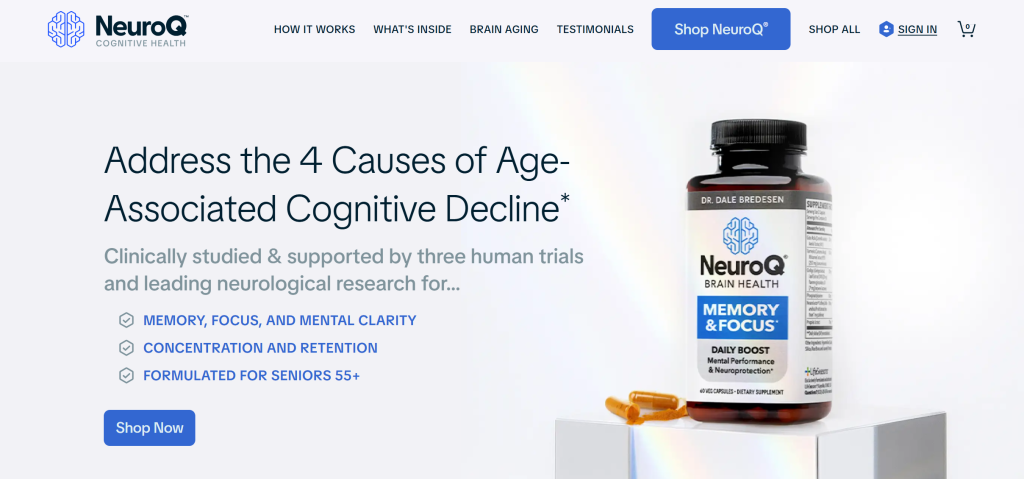 NeuroQ is a brain health supplement built around ingredients associated with cognitive support and developed with input from neurologist Dr. Dale Bredesen. The formula contains compounds that have been studied individually for brain health.