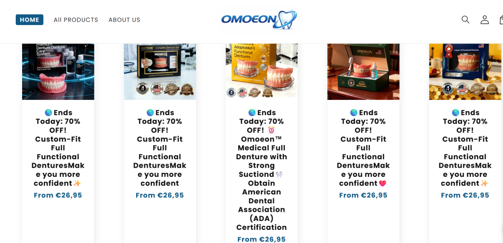Omoeon.com first caught my attention because of the unusually large discounts being advertised across the store. The website mainly promotes dentures and dental-related products, presenting them as affordable solutions for people looking for replacement teeth or dental support. The site looks polished and professional at first glance, but deals like that always make me pause, so I decided to take a closer look before trusting it with an order.