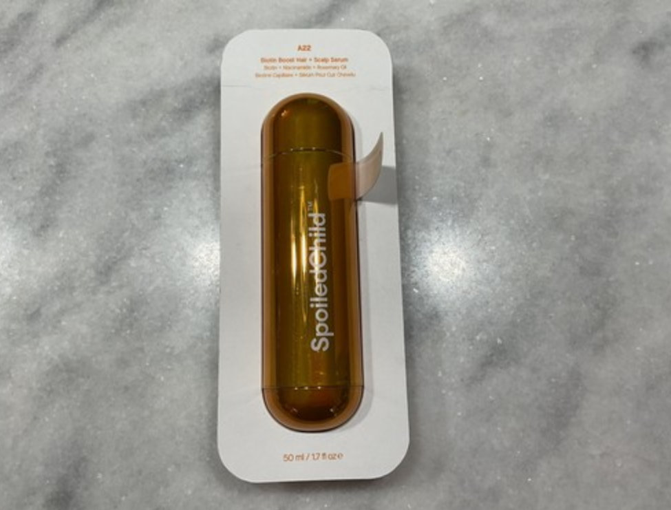 Spoiled Child A22 is a leave-in hair and scalp serum marketed to support scalp health and improve the appearance of hair over time. It is a topical cosmetic product, not a supplement and not a medical treatment. The formula focuses on biotin, niacinamide, and rosemary oil and is positioned as vegan, paraben-free, and part of the clean beauty category. The product is made by Spoiled Child and comes in a 60 ml bottle with a dropper meant to be applied directly to the scalp and left in without rinsing.