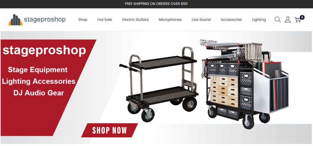 Stageproshop.com positions itself as a retailer for stage and audio equipment, including DJ controllers, lighting systems, speakers, and event production tools. The site is structured like a typical e-commerce store, with categories, product listings, and checkout functionality that mimics established equipment retailers.