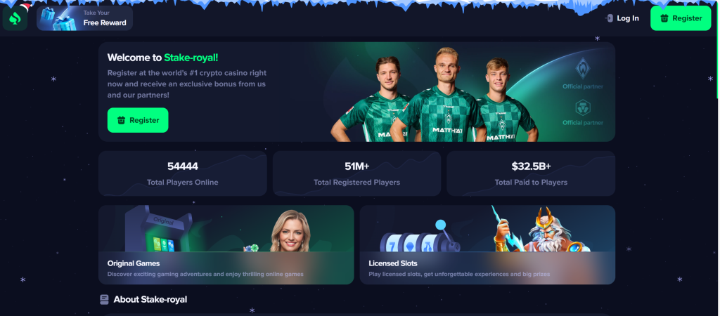 Stake-Royal.com presents itself as a blockchain-based crypto casino offering popular instant-play games and quick transactions. The site leans heavily on ideas that resonate with crypto users: transparency, speed, and independence from traditional systems. It also borrows visual cues and language commonly used by established crypto gambling platforms.
